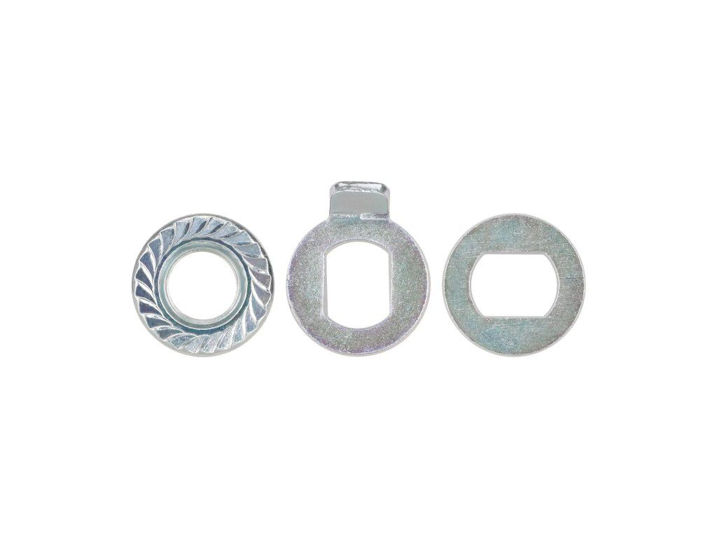 Sada nerezových matíc a skrutiek s vnútorným priemerom 12 mm pre elektrickú kolobežku KuKirin G2 Pro. Určené na pevné uchytenie motorového kolesa.