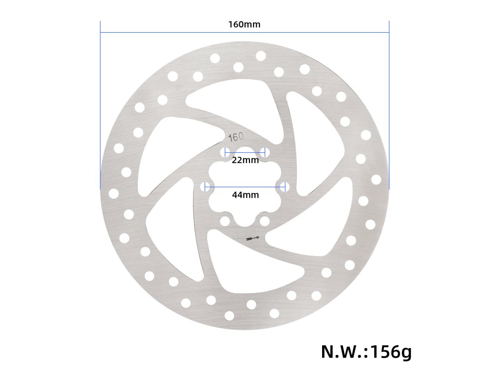 Kotúč má štandardný priemer 160 mm a 6-dierový systém uchytenia. Diagonálna rozteč skrutiek 44 mm zabezpečuje kompatibilitu s príslušnými nábojmi a presné osadenie kotúča.