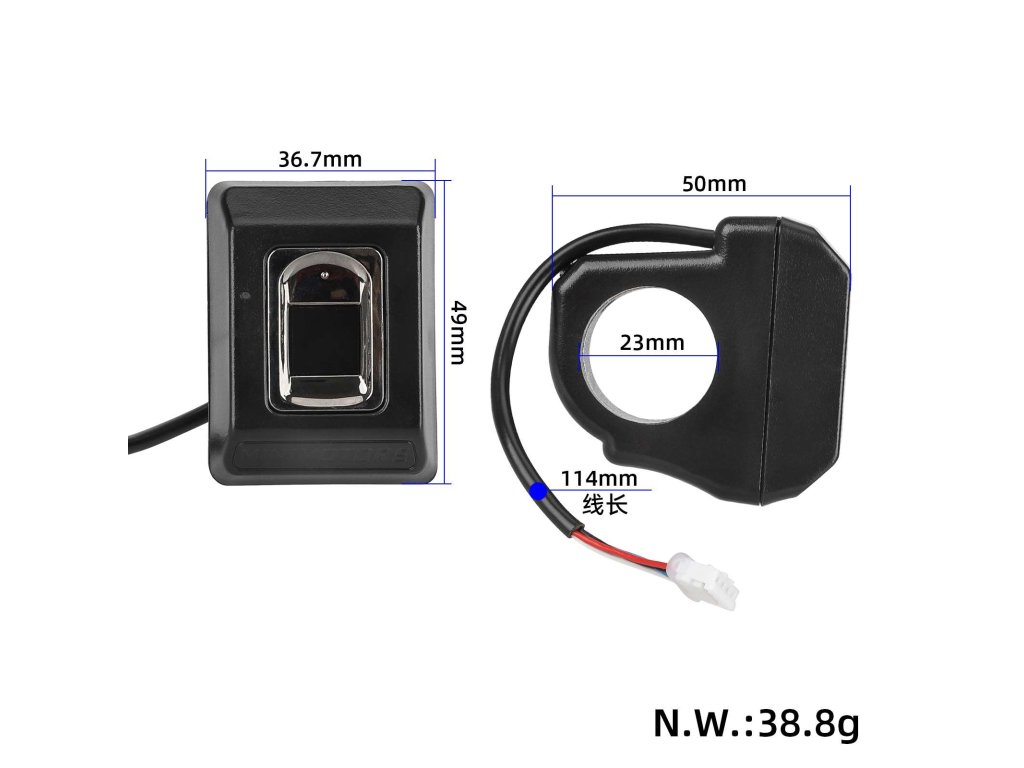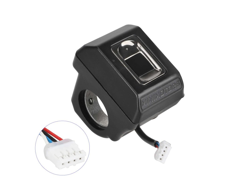 Originálny akcelerátor pre Kukirin G2 Master s integrovaným tlačidlom zapnutia a prepínačom Single/Dual Drive. Poskytuje presné ovládanie rýchlosti a plynulú akceleráciu palcom.