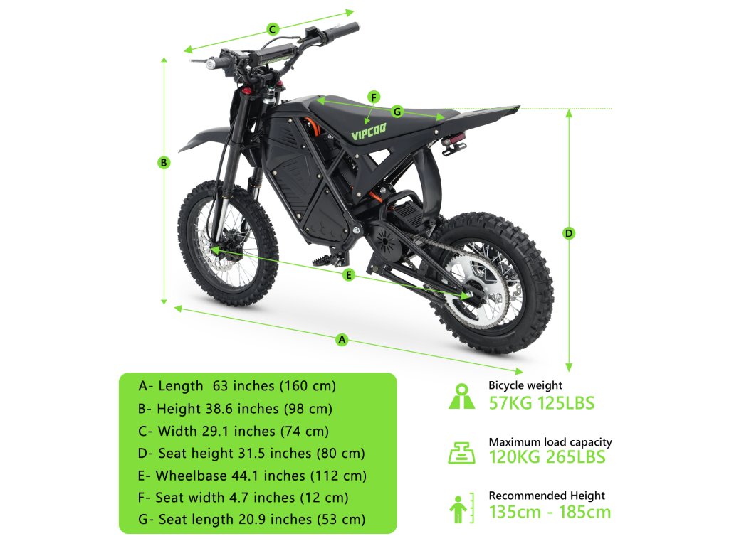 VIPCOO H3 je moderný elektrický dirt bike navrhnutý pre jazdcov, ktorí hľadajú silu, stabilitu a spoľahlivosť v každom type terénu. Kombinuje robustný motor 3500 W, kvalitnú odnímateľnú batériu a špičkové odpruženie, vďaka čomu je ideálny pre adrenalínové výjazdy po lesných cestách, štrkových trasách či off-road tratiach.