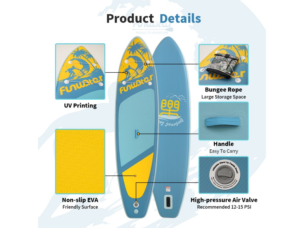 Paddleboard má rozmery 350 x 87 x 15 cm, čo zaručuje výbornú stabilitu a pohodlné ovládanie. Je vyrobený z odolných materiálov a navrhnutý na tlak 12-15 PSI, čo zabezpečuje optimálnu pevnosť a výkon pri jazde.