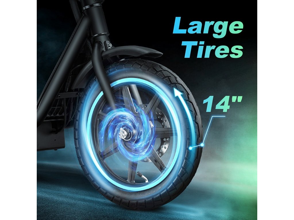 Skladacia elektrická kolobežka s 14-palcovými pneumatikami, pneumatiky majú vysokú pružnosť a odolnosť proti opotrebovaniu a dobrú priľnavosť a výkon pri odvode tepla, neohrozujú bezpečnosť. Skladacie riadidlá sa ľahko prenášajú.