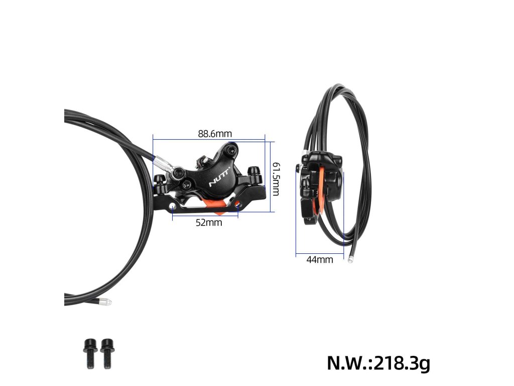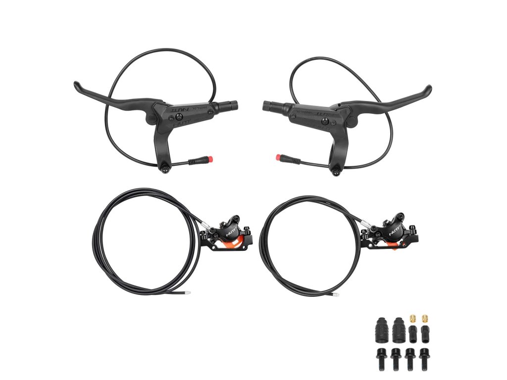 Kompletný set ľavej prednej hydraulickej brzdy NUTT pre elektrické kolobežky. Obsahuje 2-piestový strmeň, brzdové lanko dĺžky 180 cm, olejovú hadicu 220 mm a 2-pinový vypínací...
