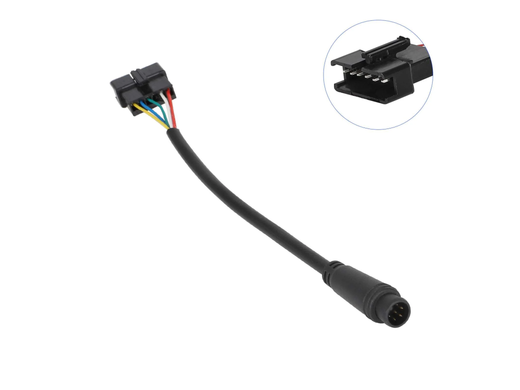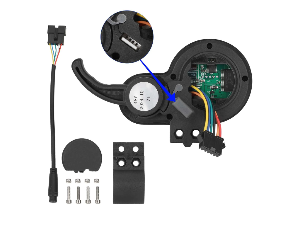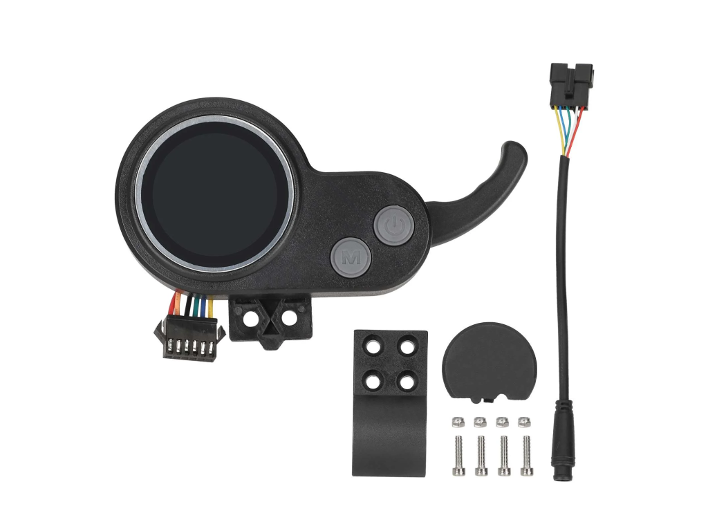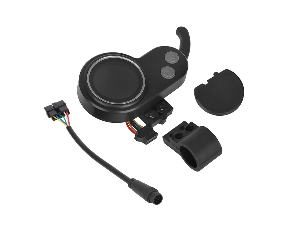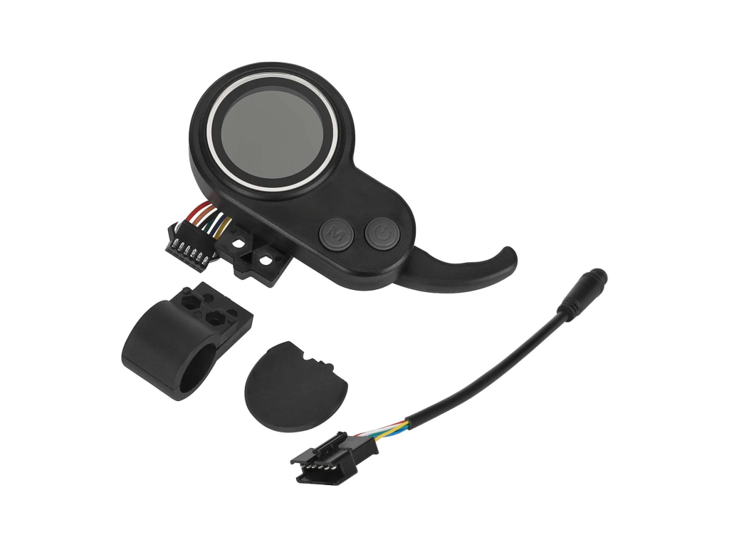 Set obsahuje všetky potrebné komponenty pre riadenie kolobežky – LCD displej, akcelerátor, prepínače a prepojovacie káble.