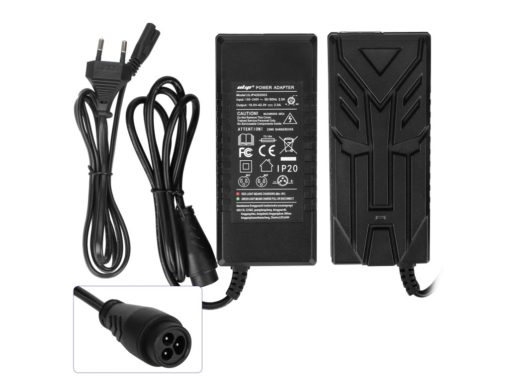 Univerzálna nabíjačka pre 36V lítiové batérie s výstupom 42V / 2A, vybavená DC 2.1 konektorom a sadou 6 výmenných adaptérov. Vhodná pre elektrické kolobežky a ďalšie elektrické...