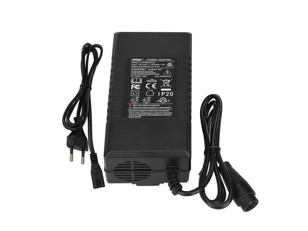 Univerzálna nabíjačka 42V 2A s konektorom DC2.1 a európskou zástrčkou, vhodná pre mnoho elektrických kolobežiek. Poskytuje stabilné, bezpečné a efektívne nabíjanie batérie.