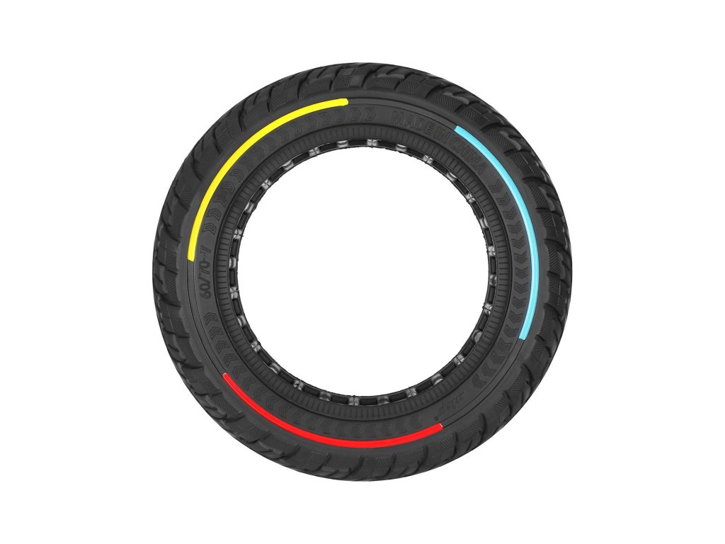 Trojfarebný kruh dodáva kolobežke originálny a športový vzhľad, vďaka ktorému sa pneumatika vizuálne odlišuje od štandardných modelov.