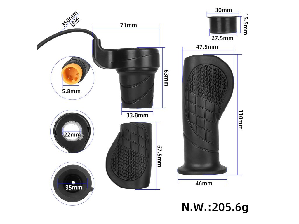 Pravostranný palcový akcelerátor Wuxing s vodotesnou hlavou 8 mm pre presné ovládanie rýchlosti. Určený pre elektrické kolobežky a e-vozidlá, poskytuje plynulú reguláciu výkonu,...
